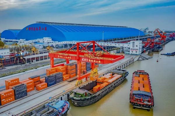 Liangshan Port, part of Jining Port in Shandong province, handles containers efficiently along inland waterways. [Photo/WeChat account: gh_ccfd1293bad8]